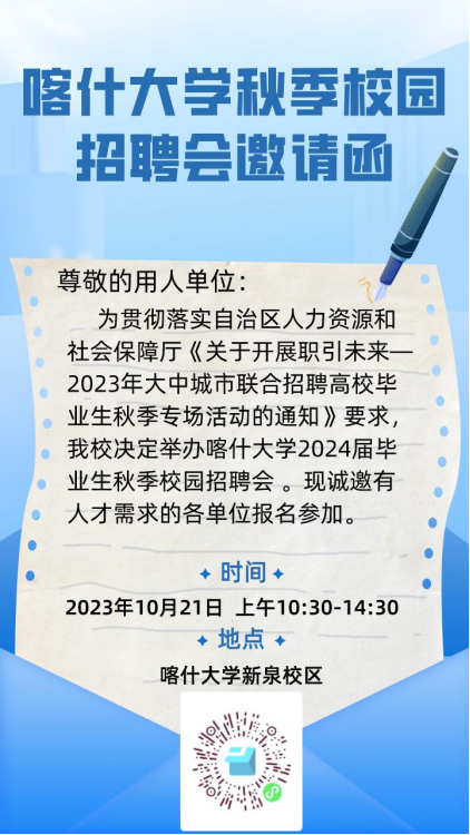 您好!首先衷心地感谢各用人单位对bat365就业工作的大力支持和全力配合。为深入贯彻党的二十大关于“实施就业优先”的重大战略,落实党中央国务院关于“稳就业”“保就业”系列决策部署和教育部促进高校毕业生高质量充分就业的工作要求,为更好地为用人单位和毕业生提供安全、便捷、高效地信息沟通和双向选择平台,自治区人力资源和社会保障厅定于2023年10月21日(周六)在bat365中文官方网站新泉校区举办《“职引未来”--2023年全国大中城市巡回招聘“新疆站”bat365中文官方网站专场招聘会》。在此诚挚邀请各行业用人单位参会!