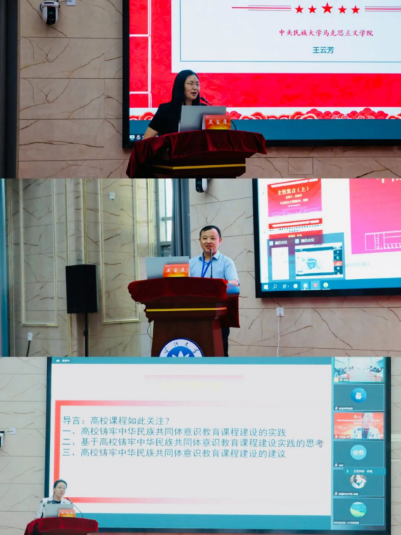 主旨发言环节,来自中央民族大学、上海师范大学、中南民族大学、呼和浩特职业学院的5位专家学者围绕铸牢中华民族共同体意识课程建设、铸牢中华民族共同体意识思政课程与课程思政的协同互构、南疆地区铸牢中华民族共同体意识教育教学的着力点等作了主旨发言。