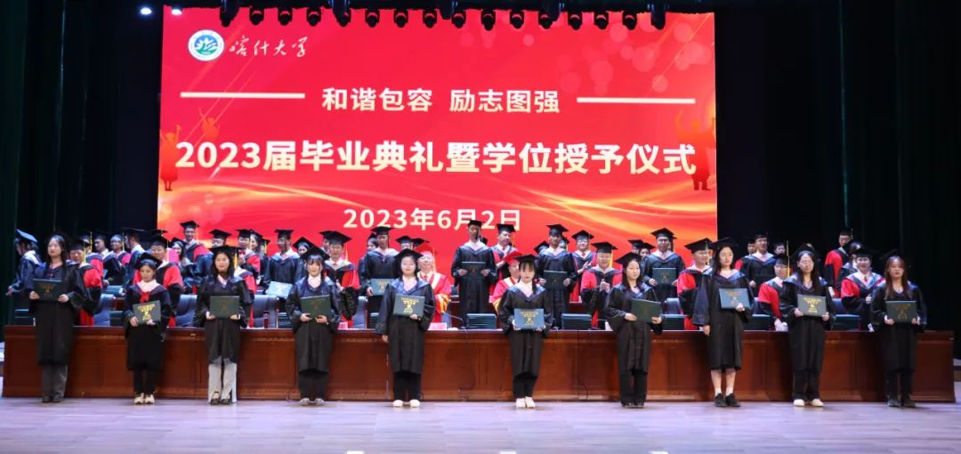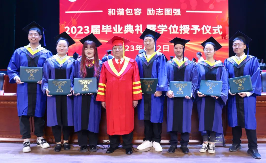 校领导、学位委员会委员和导师代表向2023届毕业生们拨穗正冠,颁授学位证书,并合影留念。