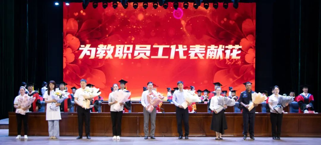 毕业生为辛勤工作的银龄教师代表苏新春、援疆教师代表吕厚轩、专业教师代表彭慧、辅导员代表曹玉东、宿管人员代表常霞、巡逻队员代表希尔艾力·麦麦提、医务人员代表古丽娜孜·居来提、餐饮人员代表茹鲜姑丽·麦麦提敏、保洁人员代表米热姑丽·麦麦提依明献花致谢。